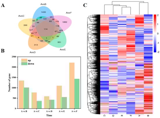 Changes in differentially expressed genes at various time points after drought stress. (A) A Venn diagram of differentially expressed genes; (B) The number of up- and down-regulated genes in each period; (C) A cluster analysis of DEGs in each period (red indicates high expression, and blue indicates low expression; A: 0 days; B: drought stress-3 days; C: drought stress-6 days; D: drought stress-9 days; E: drought stress-12 days; F: drought stress-15 days).