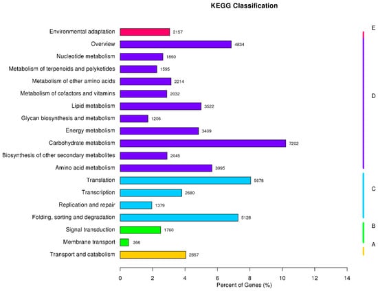 A total of 70,527 unigenes were annotated to the KEGG database (Figure 4), which were then divided into the following five main biochemical metabolic pathways: Cellular Processes, Environmental Information Processing, Genetic Information Processing, Metabolism, and Organic Systems. Among them, metabolic pathways accounted for the largest proportion, mainly including nucleotide metabolism, the metabolism of terpenoids and polyketides, the metabolism of other amino acids, the metabolism of cofactors and vitamins, lipid metabolism, the synthesis and metabolism of polysaccharides, energy metabolism, carbohydrate metabolism, the biosynthesis of secondary metabolism, and amino acid amine metabolism pathways, of which unigenes annotated the largest number of carbohydrate metabolism pathways, indicating that garlic is more likely to cause changes in carbohydrate metabolism pathways under drought stress.