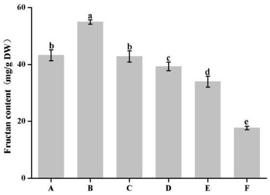 The fructan contents of garlic under drought stress. Different lowercased letters in the same treatment indicate statistical significance (p < 0.05). A: 0 d, B: drought stress-3 d, C: drought stress-6 d, D: drought stress-9 d, E: drought stress-12 d, F: drought stress-15 d.