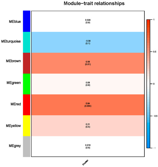 Module–trait relationship with fructan contents. The number represents the correlation coefficient of modules with fructan contents. The number in the brackets indicates the p-value.