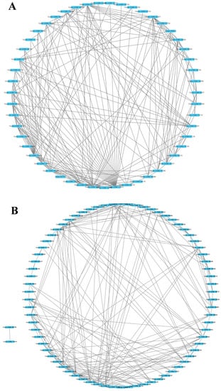A network analysis of the hub genes in MEred and MEbrown modules that had a high correlation coefficient (0.56–0.64) related to fructan contents. (A) MEred module; (B) MEbrown module.