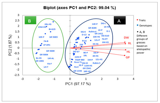 Principal component analysis (PCA) of extracts of 50 grass genotypes of the family Poaceae with respect to their germination indices. According to the results obtained, two components explained 99% of the total variation. Therefore, the genotypes were divided into two groups. Group A comprises the genotypes that had the least inhibitory effect on the traits studied and showed high values of germination, rootlet length, shootlet length, and dry weight. Group B includes the genotypes that had the greatest inhibitory effect on the traits studied and caused a significant decrease in germination traits, indicating their greater allelopathic activity.