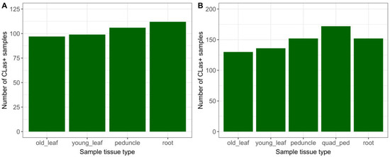 CLas+ detections by sample tissue type, for (A) 451 sampling events, November 2019–April 2021; and (B) 314 sampling events, April–October 2021 (including Q-P).