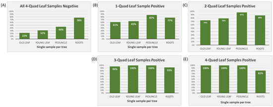 Percentage of positive samples (of young leaves, old leaves, fruit peduncles, and feeder roots) in cases when between zero and all four samples included in the quadrant leaf sample tested positive (n = 642). (A) All four quadrant leaf samples tested negative (n = 479); (B) only one quadrant leaf sample tested positive (n = 36); (C) two quadrant leaf samples tested positive (n = 36); (D) three quadrant leaf samples tested positive (n = 28); and (E) all four quadrant leaf samples tested positive (n = 63).