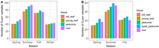 CLas-positive detections by season and sample tissue type, for (A) 765 sampling events, November 2019–October 2021 (full time series excluding Q-P); and (B) 314 sampling events, April–October 2021 (subset of time series including Q-P, which was not collected during any winter months). The full two-year time series is shown in the first figure so that there are an equal number of seasons (two years of each season); showing only November 2019–April 2021 results in there being two years of winter season data, but only one year of the other seasons, which would inaccurately skew the figure with an excess count in the winter season.