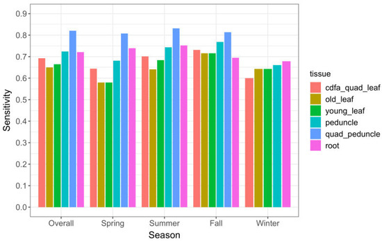 Quadrant-peduncle samples (n = 314) were collected in the spring, summer, and fall seasons of year 2. During this time period, Q-P samples had consistently higher CLas-positive counts than any other tissue sample type (Figure 3B). They also had a consistently higher likelihood of detecting infected trees both overall and in every season in which they were sampled (Table 2 and Figure 4); the sensitivity was higher than all other study sample tissues and also regulatory quadrant-leaf samples.