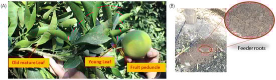 Four tissue types: (A) old and young leaves, fruit peduncle/bark, and (B) feeder roots (shown in the zoomed picture in the subfigure) were used to test the relative titer of ‘Candidatus Liberibacter asiaticus’ in all four seasons.