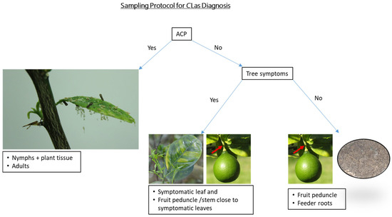 Manjunath et al. [29] recorded the spread of CLas in an area by detecting the pathogen in its insect vector, D. citri, one to several years before the development of HLB symptoms in plants. Based on these findings and the current study, to improve CLas detection, an ideal sampling method (Figure 6) would involve: