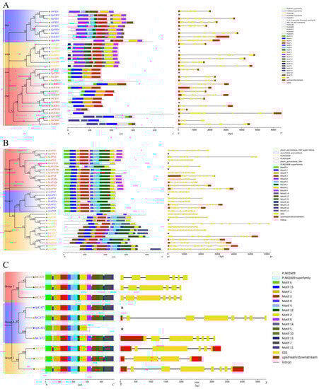 Figure 1. Phylogenetic relationships, gene structure, motifs and domains of the identified genes. (AC) show the phylogenetic relationships, gene structure, motifs and domains of SOD, APX and CAT, respectively. * indicates no genetic structure.