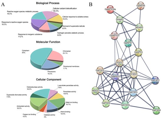 Gene annotation results showed (Figure 2A) that GpSOD, GpAPX and GpCAT were mainly involved in seven biological processes including removal of superoxide radicals (GO:0019430), cellular response to oxidative stress (GO:0034599) and reactive oxygen species metabolic process (GO:0072593). MF annotation results showed that these genes have catalase activity (GO:0004096), superoxide dismutase activity (GO:0004784) and peroxidase activity (GO:0004601). The CC enrichment analysis confirmed that these genes were mainly associated with the cellular components of cytoplasm (GO:0005737), chloroplast (GO:0009507) and peroxisome (GO: 0005777) and other cellular components. The results of the protein interaction prediction showed that there is a very significant interaction among the GpSOD, GpAPX and GpCAT genes (Figure 2B). The above results demonstrated the major role of the antioxidant enzyme genes in response to oxidative stress in G. przewalskii.