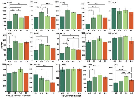 Gene expression value was calculated using Bowtie2 (2.2.9) [36] to align the CDS of each member of the SOD, APX and CAT gene families of G. przewalskii to the leaf transcriptome data (not published), and the number of read segments on the alignment was counted using a custom Perl script. RPKM was expressed as the number of reads per million reads aligned to genes per Kb base. Finally, the significance of differences between treatments (p < 0.05) was analyzed by one-way ANOVA, using SPSS (22.0), and plotted using Origin 2021.