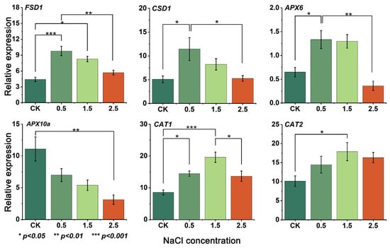 Figure 4. RT-qPCR analysis of antioxidant enzyme genes in G. przewalskii under NaCl stress. X-axis indicates NaCl concentration (%), while Y-axis indicates relative expression level.