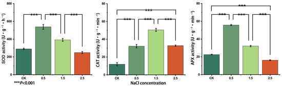 From each NaCl treatment, 0.2 g of fresh leaves were weighed separately, and the enzyme solution was extracted using phosphate buffer at pH 7.8. SOD [26] activity was determined using the nitrogen blue tetrazolium reduction method, and APX [27] and CAT [28] activities were accomplished by UV spectrophotometry.
