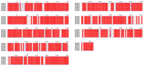 The comparison of the physicochemical properties of the proteins showed that both GpCAT1 proteins had higher hydrophilicity and stability compared to AsCAT1 proteins, with hydrophilicity of GpCAT1 and AsCAT1 proteins being −0.522 and −0.518 and instability indexes of GpCAT1 and AsCAT1 proteins being 31.32 and 43.67, respectively (Table 1).
