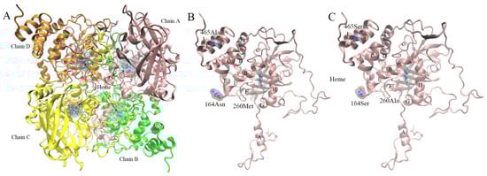 Figure 7. Protein 3D structure diagram. (A) is a 3D structural diagram of protein of GpCAT1 and AsCAT1, and (B,C) are schematic diagrams of mutation sites of GpCAT1 and AsCAT1 protein, respectively. Small letters of A to L in (B,C) are spiral structures on subunit A of CAT protein.