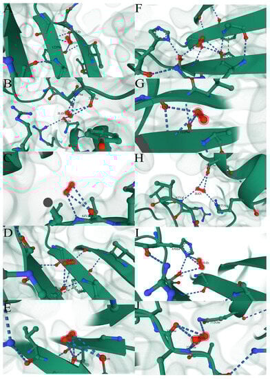 Figure 8. Binding site of CAT1 protein and H2O2. (AE) are the conformations of the first five sites of AsCAT protein binding to H2O2. (FJ) are the conformations of the first five sites of AsCAT protein binding to H2O2.