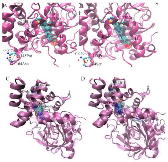 The function of proteins is directly related to their structures. In order to elucidate how the above potential positive selection site of the GpCAT1 gene causes changes in phenotypes such as increased volume of the active center of proteins and higher hydrophilicity through changes in protein structure, this study analyzed the potential positive selection site of the GpCAT1 gene through amino acid site mutation and a protein structure comparison. The results showed that the mutation at amino acid position 164 of the GpCAT1 protein resulted in the addition of one hydrogen bond between amino acid 164 and amino acid 161, and this force led to the deflection of the B-helix of the nudibranch CAT1 protein in the direction away from the H-helix (the Cα distance between amino acid positions 164 and 148 of the nudibranch and ancestral CAT1 proteins was detected to be 0.047 nm and 0.049 nm), resulting in an increase in the angle between the B- and H-helices. The distance between amino acid 150 in the B-helix and amino acid 330 in the H-helix increased from 0.076 nm in the ancestral the CAT1 protein to 0.082 nm in Naked Nutmeg (Figure 9A,B). Both the B- and H-helices are located at the heme pocket, which is very favorable for increasing the volume of the heme pocket.