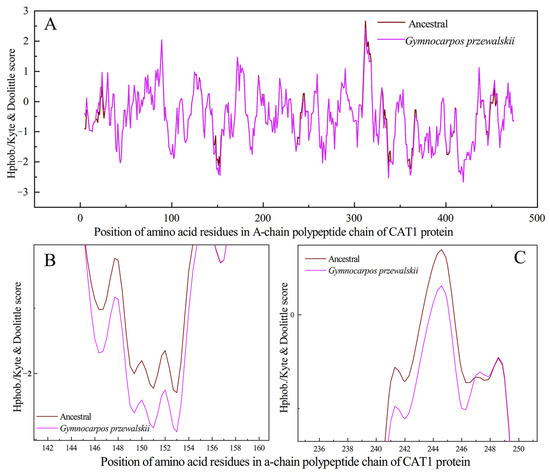 Figure 10. Hydrophilicity distribution of GpCAT1 and AsCAT1 polypeptide chains. (A) shows the hydrophilic distribution of amino acid residues in the ancestral CAT1 polypeptide chain of G. przewalskii and Ancestral. (B,C) show the hydrophilic distribution of peptides at amino acid residues 164 and 260 in the ancestral CAT1 polypeptide chain of G. przewalskii and Ancestral, respectively.