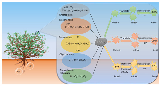 Reactive oxygen species (ROS) are the inevitable products of aerobic metabolism, and under normal physiological conditions, as signaling molecules, they can mediate plants’ stress response to various external stimuli. However, when plants experience both biotic and abiotic stress, organelles such as mitochondria, chloroplasts and peroxisomes, all generate high amounts of ROS, leading to the overaccumulation of intracellular ROS which results in oxidative stress in the plant [6]. To prevent the damage of ROS during aerobic conditions, organisms have formed a variety of defense mechanisms during evolution, including evasion defense, antioxidant defense and post-oxidative defense, and antioxidant defense is the main mechanism for plant organisms to defend against oxidative stress. Antioxidant system is the main pathway of antioxidant defense, including antioxidant enzyme system and antioxidants [7]. Antioxidant enzyme system mainly includes superoxide dismutase (SOD), catalase (CAT) and ascorbate peroxidase (APX). The antioxidative enzyme system is an important pathway for scavenging ROS in plants, which protects plants from ROS during plant growth and development [8]. There is increasing evidence that antioxidant enzymes play a crucial role in maintaining ROS homeostasis in plant cells under salt stress [6,8,9].