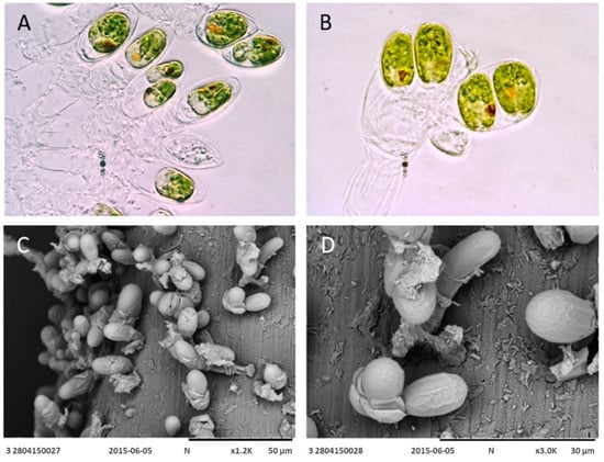 Spreading the samples on agar plates resulted in the growth of different colonies, which were isolated according to their color and growth characteristics. Colonies of the strain AC16-MESO were of an intense green and grew well both on solid and in liquid f/2 medium. Bright-field microscopy revealed ellipsoid cells of 15–20 µm length and 5–10 µm width, with a basal pyrenoid and a clearly visible eyespot in varying positions (Figure 1A,B). Cells divided in asexual reproduction, resulting in two daughter cells in mirror positions (Figure 1B). Cells were in a persistent benthic state with colonies forming on a septate pedunculus (Figure 1A,B). Transmission microscopy revealed how these structures allow the microalga to adhere the substrate and showed that the cells are covered by a theca resulting from the fusion of extracellular scales (Figure 1C,D).