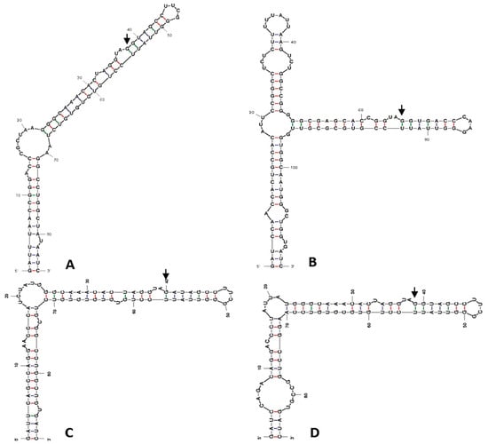 Secondary structure predictions for ITS-2 helix III (5′ to 3′). (A) T. suecica, Tetraselmis sp. CCM-UDEC 109 (from Dichato), and Tetraselmis sp. CCM-UDEC 114 (from Coliumo), (B) T. marina AC16-MESO, T. marina IOAC331S and T. marina CCMP898. (C) T. subcondiformis and Tetraselmis sp. CCM-UDEC 134 (from Caldera), and (D) T. striata. The red color emphasizes the robust G-C base pair interactions, crucial for both structural integrity and functional efficacy of the molecule. Blue color markings represent A-U interactions and green markings denote G-U interactions. Arrows indicate potential RNA processing sites.