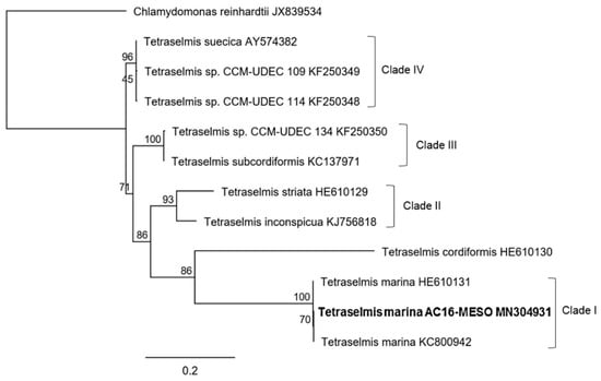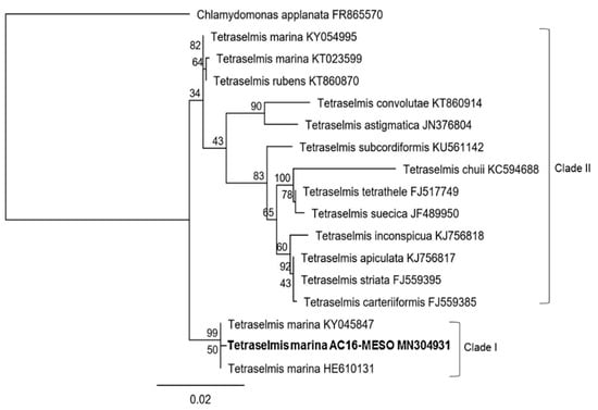 Both phylogenetic trees of AC16-MESO and strains with highly similar sequences identified in the NCBI GenBank BLAST analysis classify AC16-MESO as part of the family Chlorodendraceae within the genus Tetraselmis (Figure 4 and Figure 5); likewise, both trees indicate a close relationship with the species Tetraselmis marina. Figure 4 shows the tree based on 18S ribosomal sequences; in it, T. marina AC16-MESO, T. marina CCMP898 (HE610131), and T. marina (KY045847) are grouped together with a bootstrap value of 99; they form clade I (Figure 4). Its sister clade, clade II (bootstrap value 34), comprises the others strain of T. marina (KY054995 and KT023599) (bootstrap value 82), and the other species of genus Tetraselmis: T convolutae and T. astigmatica (bootstrap value 90); T subcordiformis, T. chuii, T tetrathele, T. suecica, T. inconspicua, T. apiculata, T. striata, and T. carteriiformis (bootstrap value 83).