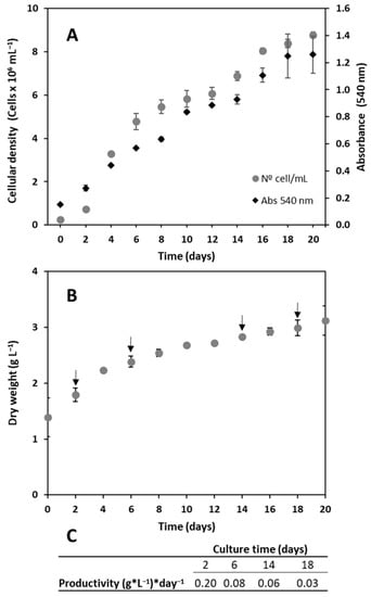 Growth curve of strain T. marina AC16-MESO over 20 days expressed as (A) cell density (cells × 106/mL) and absorbance at 540 nm, and (B) biomass dry weight (g/L). Values represent the mean ± SD of three independent measurements in 2-liter reactors (n = 3). (C) The table shows the production (g L−1 day−1) during the exponential phase (day 2), early stationary phase (day 6), stationary phase (day 14), and late stationary phase (day 18). The arrows indicate the times for which biomass production was estimated.