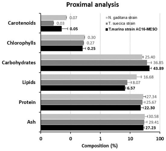 Proximal analysis of T. marina AC16-MESO compared with reference biochemical analyses of N. gaditana and T. suecica. The reference strains were cultivated in the same facilities as the study strain and are part of the collection stock of the Applied Microbiology Unit, University of Antofagasta. Values represent the mean ± SD of three independent measurements (n = 3).