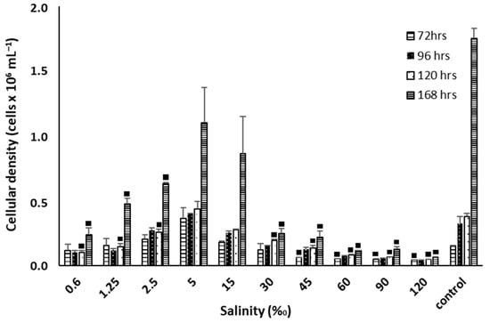 T. marina. AC16-MESO was exposed to different salinities ranging from 0.6 to 120‰. The highest cellular densities were found for 2.5‰ (6.3 × 105 cells/mL), 5‰ (1.1 × 106 cells/mL), and 15‰ (8.6 × 105 cells/mL) and was similar to the control (35‰). At lower (0.6–1.25‰) and higher salt concentrations (30–120‰), the cellular density was significantly affected. At 168 hours, the cell density values were lower than the control for all salinity conditions, and the differences in cell density were statistically significant (p < 0.05) (Figure 8).