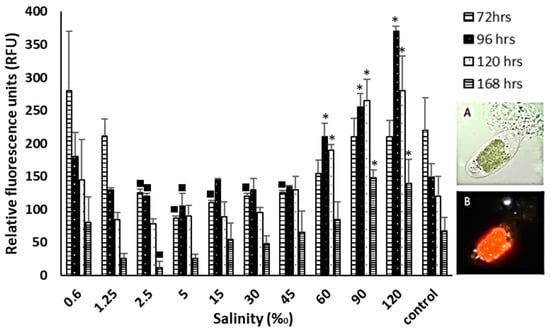 Relative fluorescence units (RFUs) are positively correlated with lipid accumulation. In Figure 9, the location of lipids stained with Nile red in the cell interior is observed. At 0.6‰ salinity, RFU values were higher for T. marina AC16-MESO than the control, with a 32% increase at 72 h, 23% at 96 h, 21% at 120 h, and 26% at 168 h. Likewise, for 60‰, 90‰, and 120‰ salinity, the increases over the control were of 33%, 71%, and 138%, respectively, at 96 h; 60%, 124%, and 137% at 120 h, and 37%, 108%, and 97% at 168 h. On the other hand, at 1.25‰, no different differences were observed and between 2.5 and 45‰ salinity, the RFUs were lower than for the control (Figure 9).