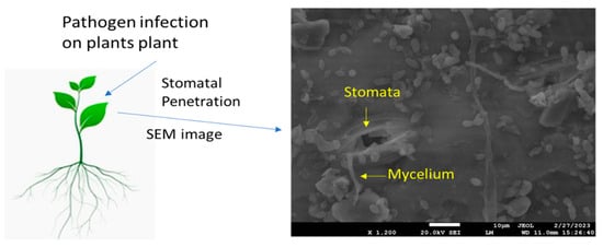 Stomatal exclusion is a vital defense mechanism in plants, preventing pathogen entry and protecting against infections [29]. Rust fungi, such as the leaf blade-specialized rust fungi Puccinia triticina and P. coronata, causing wheat leaf rust and oat crown rust, respectively, have been suggested as the cause of the low prevalence of leaf sheath and peduncle infection in cereal crops through stomatal exclusion, also known as failed stoma penetration. The stem-specific stem rust fungus invades the stomata in leaf sheaths and peduncles at considerably higher rates than the leaf blade-specific leaf and crown rust fungi [29,30]. According to these findings, the degree of stomatal exclusion varies among cultivars, and intriguingly, the mechanism in charge appeared to extend to the leaf blade on the oat cultivar “Garry”; however, a more recent study was unable to substantiate the notion that stomatal exclusion shields leaf sheaths from P. triticina and P. hordei. In general, rust germination on leaf blades appears to be quite rare, and host genotype variations were insignificant or unpredictable [31]. Current research on maize demonstrated that the number of stomata, size of stomata, and type of cultivar all affect the penetration of fungi [32,33,34]. However, the susceptible variety exhibits a wider stomatal aperture and greater fungal mycelium deposition around the stomata (Figure 1). There are variations in the rust fungus Uromyces viciae-stomatal fabae’s exclusion amongst faba bean cultivars [35]. Some accessions had fewer substomatal vesicles that formed outside of the leaves than inside the substomatal cavity. These differences were substantial, but they were too small to be anticipated to have a significant epidemiological effect [36]. Minor changes in the stomatal exclusion of the barley leaf rust fungus, brought on by the formation of the substomatal vesicle prior to stoma penetration, were also discovered in a group of barley eceriferum mutants; however, once more, the frequencies were too low to affect the epidemic. In the case of diseases other than rusts, it has been observed that germ tubes may leave stomata after entering them, and it has been reported that this event occurred in tomato/Cladosporium fulvum, where the tomato genotype had a strong gene for resistance to hypersensitivity, but the author did not quantify this component [37]. One such study suggests that stomatal closure is induced by chitin and chitosan present in the fungal cell wall [38]. The level of stomatal exclusion may be significant in various plant pathosystems, such as powdery mildew fungi, which are another group of pathogens known to interact with stomata during their infection process. These fungi are spread by the germination of spores on the surface of plants. These spores’ germ tubes have the ability to actively enter the plant tissues via the stomata. Once within the substomatal cavity, the fungus grows and creates haustoria, which are feeding structures that draw nutrients from the host cells [39]. According to some studies, the stomata size and distribution can affect how well powdery mildew spores penetrate surfaces. Different plant species and cultivars may exhibit differences in stomatal density, size, and aperture, which may influence their susceptibility to powdery mildew infection. The efficacy of stomatal exclusion against powdery mildew fungus might also depend on host genetic variables [40].