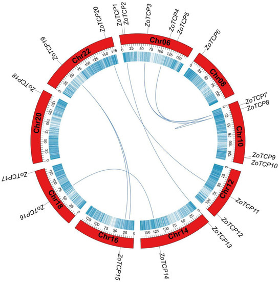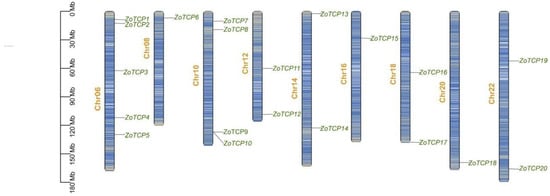 Using the available genome information of ginger, a chromosome mapping map was generated (Figure 1). Analysis of the chromosome localization information for the ZoTCP gene family revealed an uneven distribution pattern among the 20 TCP genes in ginger. Random distribution was observed on nine chromosomes, including Chr.06 to Chr.22, with varying numbers of TCP genes ranging from one to five. Remarkably, the Chr.06 chromosome harbored the highest number of TCP genes, with a total of five. Conversely, the Chr.08, Chr.16, and Chr.20 chromosomes each contained only one TCP gene. Additionally, Chr.12, Chr.14, Chr.16, and Chr.22 accommodated two TCP genes, while Chr.10 possessed four TCP genes. Notably, the positions of ZoTCP9 and ZoTCP10 on Chr.10 were found to be highly similar, suggesting a potential tandem replication event in the evolution of the ZoTCP gene family. This event may have contributed to the evolutionary dynamics and diversification within the ZoTCP gene family.