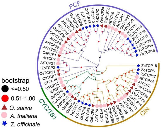 A rootless phylogenetic tree was constructed based on TCP proteins of ginger (Zingiber officinale), Arabidopsis thaliana, and rice (Oryza sativa). The phylogenetic tree was divided into PCF, CIN, and CYC/TB.
