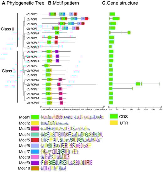 Phylogenetic relationship, gene structure, and conserved motif structure of ZoTCP protein. (A) Phylogenetic tree was constructed based on ZoTCP protein. (B) The motif structure of ZoTCP protein contains 10 Motifs (Supplementary Material File S3: Figure S2). (C) Exon–intron structure.