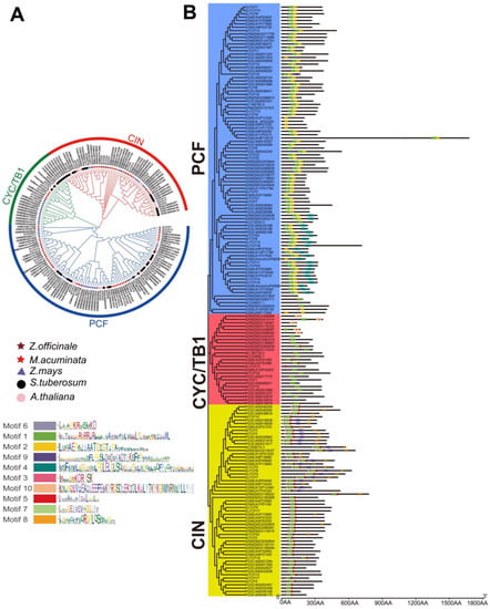 The phylogenetic relationship and conserved protein motif structure of TCP proteins in Z. officinale, S. tuberosum, A. thaliana, Z. mays, and M. acuminata. (A) According to the rootless phylogenetic tree constructed by TCP proteins of five species, it is divided into PCF, CYC/TB1, and CIN—three subgroups. (B) TCP protein motif (Supplementary Material File S3: Figure S3) composition structure of 5 species, including 10 motifs.