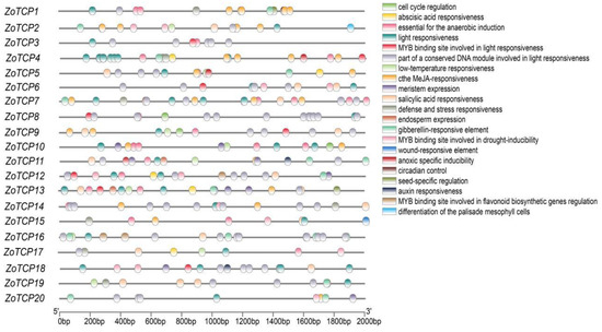 The cis-acting element structure of the ZoTCP promoter region; different colors represent different elements.