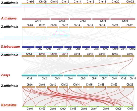 Subsequently, the replication event of ZoTCP itself was analyzed. Using the gene sequence file, the gene replication of ZoTCP was examined using MCScanX, with the default parameters of TBtools. Furthermore, gene data files for Arabidopsis thaliana, potato, small fruit wild banana, corn, and other species were obtained from the EnsemblGenomes database (https://ensemblgenomes.org/, accessed on 3 July 2023) [] The TBtoolsv1.123 software was employed to analyze the collinearity between these species’ gene sets and the ZoTCP genes, and a collinearity relationship diagram was generated.