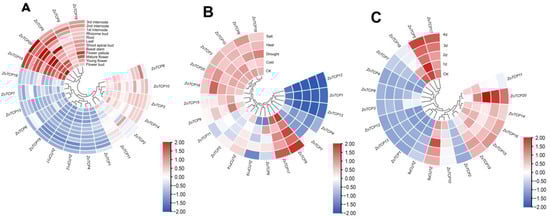 Our research group’s previous transcriptome data of various tissues of ginger and ginger under abiotic stress enabled us to analyze the expression patterns of ZoTCP under different tissue and abiotic stress conditions. Ginger tissues include young flowers, flowers, flower stalks, rhizome buds, flower buds, the first, second, and third internodes and basal stems, apical buds, and roots and leaves. Abiotic stress includes low temperature, heat, drought, and salt stress. Drought stress and salt stress treatments were conducted by irrigating the plants with a 15% PEG6000 solution and a 200 mM sodium chloride solution, respectively. High-temperature stress and low-temperature stress treatments were applied to ginger plants at 40 °C and 4 °C, respectively. Leaf samples of ginger were collected at specific time points of 1 h, 3 h, 6 h, 12 h, 24 h, and 48 h after low-temperature stress, drought stress, and salt stress treatments. The leaf samples were collected at time points of 1 h, 3 h, 6 h, 12 h, and 24 h for the heat treatment. The expression patterns of ZoTCPs were visualized using the HeatMap plugin in the TBtoolsv1.123 software.