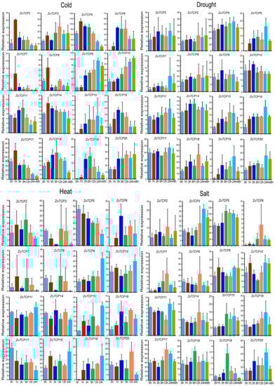The expression of ZoTCP genes under abiotic stress was detected by qRT-PCR; data ae normalized to TUB-2 gene and the vertical bar indicates the standard deviation.