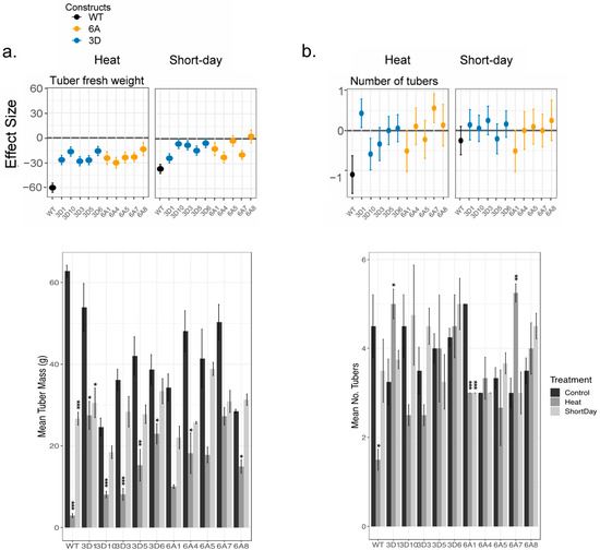 Effect of heat and photoperiod on OtsB transgenic constructs for belowground traits. Above: The effect size of heat and short days are plotted for (a) tuber fresh weight and (b) number of tubers. Columns represent treatment with heat on the left and short days on the right; each panel within those columns demonstrate estimates of the effect of that treatment on the specified trait. Each genotype’s estimate of effect and standard error, based on estimated marginal means, are plotted. Control of each genotype is the reference for each pairwise comparison. Color represents construct; see the key. The x-axis value of 0 is bolded in each graph. A value overlapping 0 indicates that there is no significant difference in traits between those grown in control vs. treatment. A positive effect indicates that individuals grown under that treatment had higher trait values, while a negative effect indicates that control individuals had higher trait vales. See Supplemental Table S2 for significant effects. Bottom: The mean and standard error of (a) tuber fresh mass and (b) the number of tubers for the same individuals. Significant effects, calculated via Dunnett’s test, of treatment within each genotype are demonstrated with the following: * p < 0.05; ** p < 0.01; and *** p < 0.001.