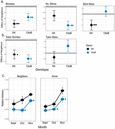 Effect of competition and herbivory on wildtype and SP3D::OtsB transgenic line 10 in mesocosm 1. The effect size of competition is plotted for (a) aboveground traits of biomass, number of stems, and stem weight and (b) belowground traits of tuber number and weight. Each genotype’s estimate of effect and standard error, based on estimated marginal means, are plotted (a,b). Individuals grown alone are the reference for each pairwise comparison of each genotype. Color represents genotype; see the key. The x-axis value of 0 is bolded in each graph; a negative effect indicates that individuals grown alone had higher trait values. The mean relative herbivory and its standard error (c) are plotted for each month. Significant difference of transgenic line from wild-type for relative herbivory is demonstrated with an asterisk (p < 0.05), from ANOVA based on GLM. See Supplemental Table S3 for significant effects. Significant chi-square values are bolded: *** p < 0.001, ** p < 0.01, and * p < 0.05.