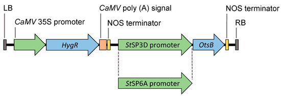 Schematic representation of SP3D::OtsB and SP6A::OtsB constructs. LB, left border T-DNA repeat; Cauliflower mosaic virus (CaMV) 35S promoter; HygR, hygromycin resistance gene; Cauliflower mosaic virus (CaMV) poly (A) signal; nopaline synthase (NOS) terminator; Solanum tuberosum SP3D/SP6A promoter; E. coli OtsB; nopaline synthase (NOS) terminator; and RB, right border T-DNA repeat.