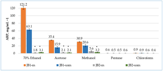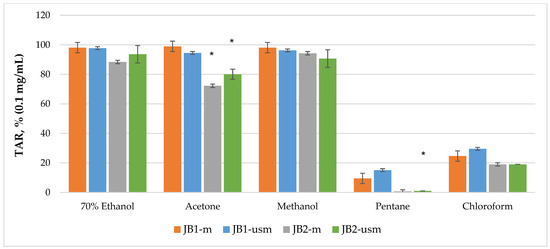 During the maceration of JB1 (JB1-m), the bioactivity of the extracts by maceration was arranged in the following order: 70% ethanol > methanol > acetone > chloroform > pentane. During ultrasound-assisted maceration, the order of solvents changed: methanol > 70% ethanol > acetone > chloroform > pentane.
