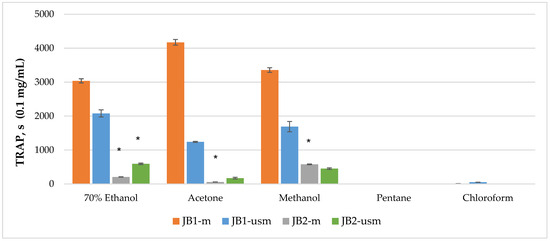 The analysis of the chemiluminescence activity of the studied extracts under normal conditions showed the highest degree of luminescence quenching and the duration of the latent period for the acetone extract JB1-m—4173 s according to TRAP value and 99% according to TAR value (Figure 2 and Figure 3). Similarly, under ultrasound-assisted maceration conditions, the 70% ethanol extract of JB1 had the greatest activity—2079 s according to TRAP value and 97.8% according to TAR. The methanol extract of JB2 had the greatest activity under normal conditions (578 s and 94.3%) with the use of ultrasound-assisted maceration, while the 70% ethanol extract had the greatest (593 s and 93.6%). According to Figure 2 and Figure 3, the extracts of JB1 extracted using ethanol, acetone and methanol contained a greater amount of strong antioxidants in their composition, while their amount decreased when using US.