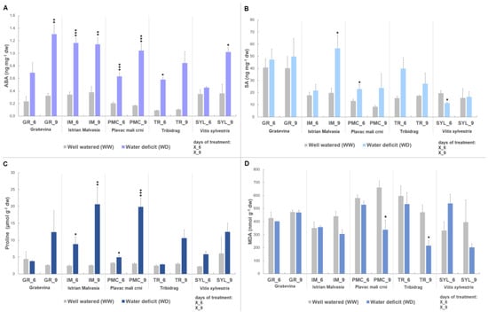 Stress responsive metabolites (ABA, SA, proline and MDA) in leaves of four Vitis vinifera L. cultivars (cvs.: Plavac mali crni—PMC; Istrian Malvasia—IM; Graševina—GR; Tribidrag—TR) and one wild V. sylvestris, SYL) under well-watered (WW) and water deficit (WD) conditions measured at two time points; six and nine days of water deficit treatment.