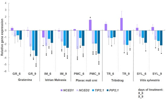 Relative gene expression of: 9-cis-epoxycarotenoid dioxygenase 1 (NCED1, VIT_19s0093g00550); 9-cis-epoxycarotenoid dioxygenase 2 (NCED2, VIT_10s0003g03750); aquaporin TIP2;1 (VIT_09s0002g04020) and aquaporin PIP2;1 (VIT_13s0019g04280) of four Vitis vinifera L. cultivars (‘Graševina’—GR; ‘Istrian Malvasia’—IM; ‘Plavac mali crni’—PMC; and ‘Tribidrag’—TR) and one wild V. sylvestris, SYL) subjected to water deficit at two time points (days six and nine) compared with the corresponding controls. Gene expression was calculated according to as relative gene expression compared to the control conditions. Untreated control equals one, via the definition of 2−ΔΔCt method used. Asterisks indicate significant differences between water deficit treatment compared with the corresponding control of each genotype (Student’s t-test, * indicates p < 0.05, ** p < 0.01, *** p < 0.001). Bars show means ± SE of three biological replicates.