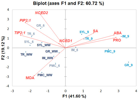 Principal component analysis (PCA) showing stress-related metabolites accompanied by selected gene expressions in four Vitis vinifera L. genotypes (‘Graševina’—GR; ‘Istrian Malvasia’—IM; ‘Plavac mali crni’—PMC; ‘Tribidrag’—TR) and one wild V. sylvestris, (SYL)) under water deficit at two time points (days six and nine) compared to the corresponding well-watered control (WW). PCA was performed on the correlation matrix of average values of stress-responsive metabolites (ABA, SA, proline (PRO) and MDA), and selected gene expression levels [9-cis-epoxycarotenoid dioxygenase 1 (NCED1, VIT_19s0093g00550), 9-cis-epoxycarotenoid dioxygenase 2 (NCED2, VIT_10s0003g03750), aquaporin TIP2;1 (VIT_09s0002g04020) and aquaporin PIP2;1 (VIT_13s0019g04280)].