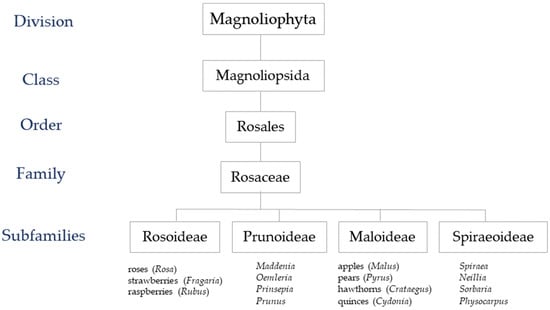Rosaceae is the 19th largest plant family with more than 3000 species from at least 100 genera [32]. The distribution of families is varied but concentrated, especially in the northern hemisphere. The most significant genera are Rosa (Rose), Fragaria (Strawberry), Malus (Apple), Pyrus (Pear), Prunus (Almond, Apricot, Cherry, Peach, Plum, and others), Rubus (Blackberry), and Cydonia (European quince) [33,34]. Within the same family, taxonomic classifications have varied significantly due to the numerous proposed categorisation approaches over the past century [35]. The traditional classification of Rosaceae includes four subfamilies: Rosoideae, Amygdaloideae (also known as Prunoideae), Maloideae, and Spiraeoideae (Figure 1) [36]. Rosoideae consists of both woody and herbaceous taxa with the well-known members including Rosa, Fragaria, and Rubus. Amygdalo ideae mostly comprise the Prunus genus, which includes peaches, plums, cherries, and almonds. Malus, Pyrus, Crataegus, and Cydonia are within the Maloideae. Lastly, the Spiraeoideae consists of woody and herbaceous plants and some well-known ornamental taxa (Spiraea) [37].