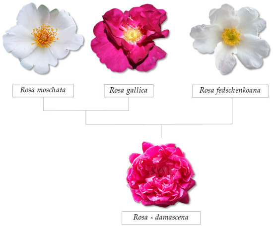 In the genus Rosa, almost 200 species and more than 18,000 cultivars have been documented [38]. Within the genus, it is divided into four subgenera based on their fruit structure, three of which are monotypic: Hulthemia (Dumort.) Focke, Hesperhodos Cockerell, and Platyrhodon (Hurst) Rehder. The fourth subgenus, Rosa, harbours about 95% of all species and is subdivided into 10 cultivars, including R. canina, R. chinensis, R. foetida, R. gallica, R. gigantea, R. moschata, R. multiflora, R. phoenicea, R. rugosa, and R. wichuraina. The modern cultivars are mostly interspecific hybrids derived from these cultivars [39,40]. There are several hypotheses surrounding the ancestry of the damask rose. However, it is believed that the plant has a triparental origin, with R. moschata as the maternal ancestor and two successive crossings (R. moschata × R. gallica) × R. fedschenkoana Regel (Figure 2). The complex allotetraploid R. damascena used for cultivation has a steady chromosomal number (2n = 4x = 28) [41,42].