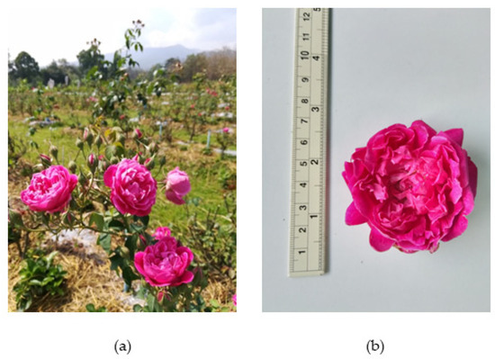 Damask rose is one of the few fragrant species among the hundreds in the Rosa genus [40]. It is a shrub that may attain a height of 2.5 metres (Figure 3a). The stems are extensively covered with curved spikes, and a four-year-old or older plant can yield between 500 and 600 flowers annually. The flowers have approximately thirty petals that range in colour from pale to medium pink to pale crimson (Figure 3b) [43]. The optimum growing temperature is between 15 and 21 degrees Celsius [44]. Common asexual methods of propagation include suckering, hardwood and semi-hardwood cutting, sprouting, and grafting [45].